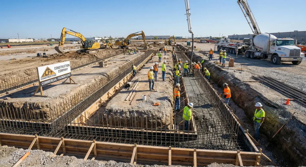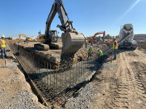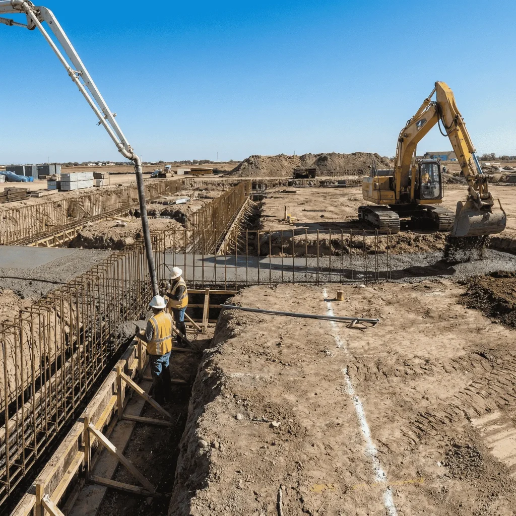 Forms are installed, reinforcement is placed, and concrete is poured with precision and strict quality control.
